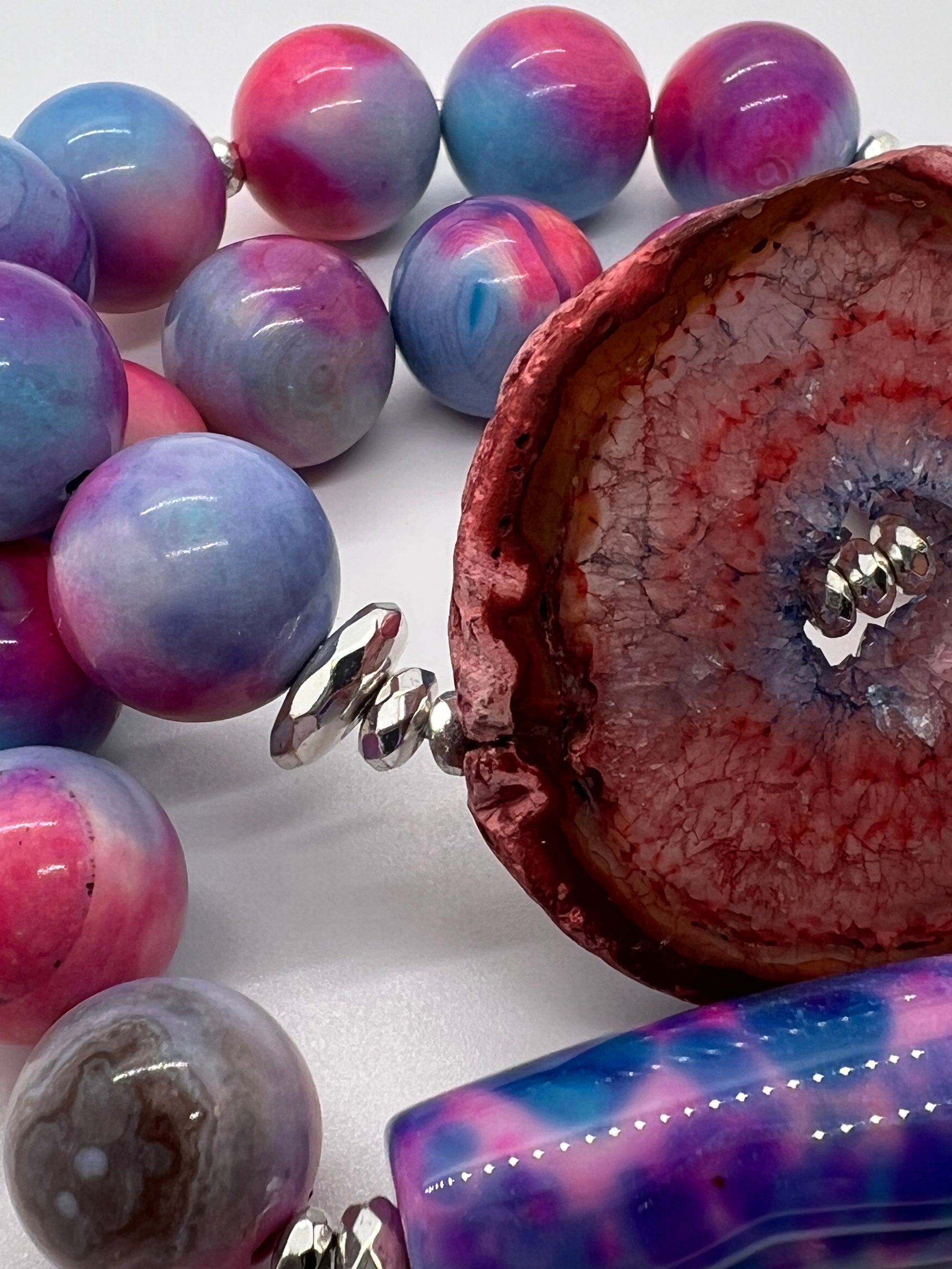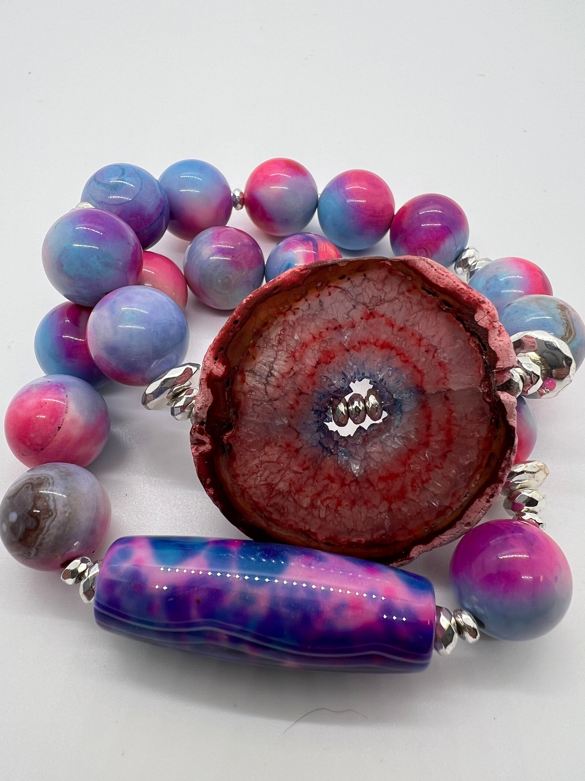 One bracelet highlights a breathtaking polished agate slice focal with shimmering crystal druzy at its center, framed in deep rose-pink tones. Another features a sleek elongated barrel-shaped agate bead in mesmerizing blue and magenta patterns, both accented by faceted silver-tone spacers for a brilliant finish.