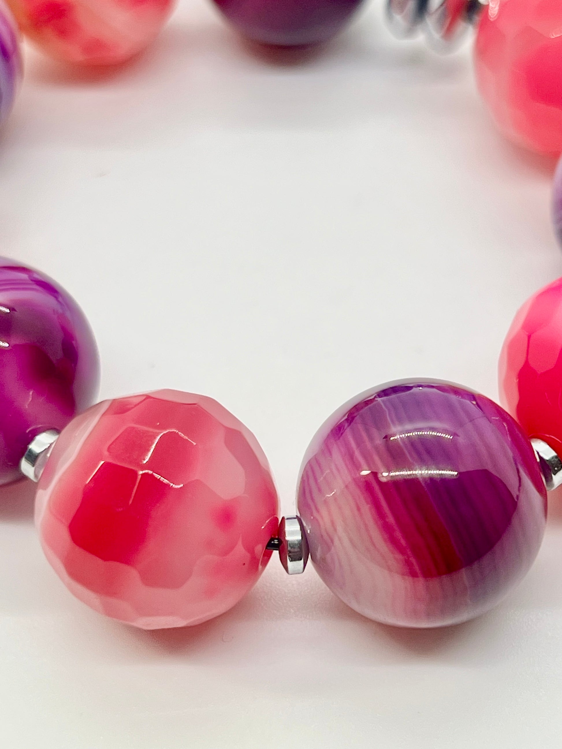 Berry Luxe is bold, vibrant, and unapologetically feminine, designed to make a statement with rich color and striking contrast. Featuring oversized 18 mm banded agate beads in fuchsia, magenta, and soft blush tones, this piece brings instant energy and a polished pop of color to your look.