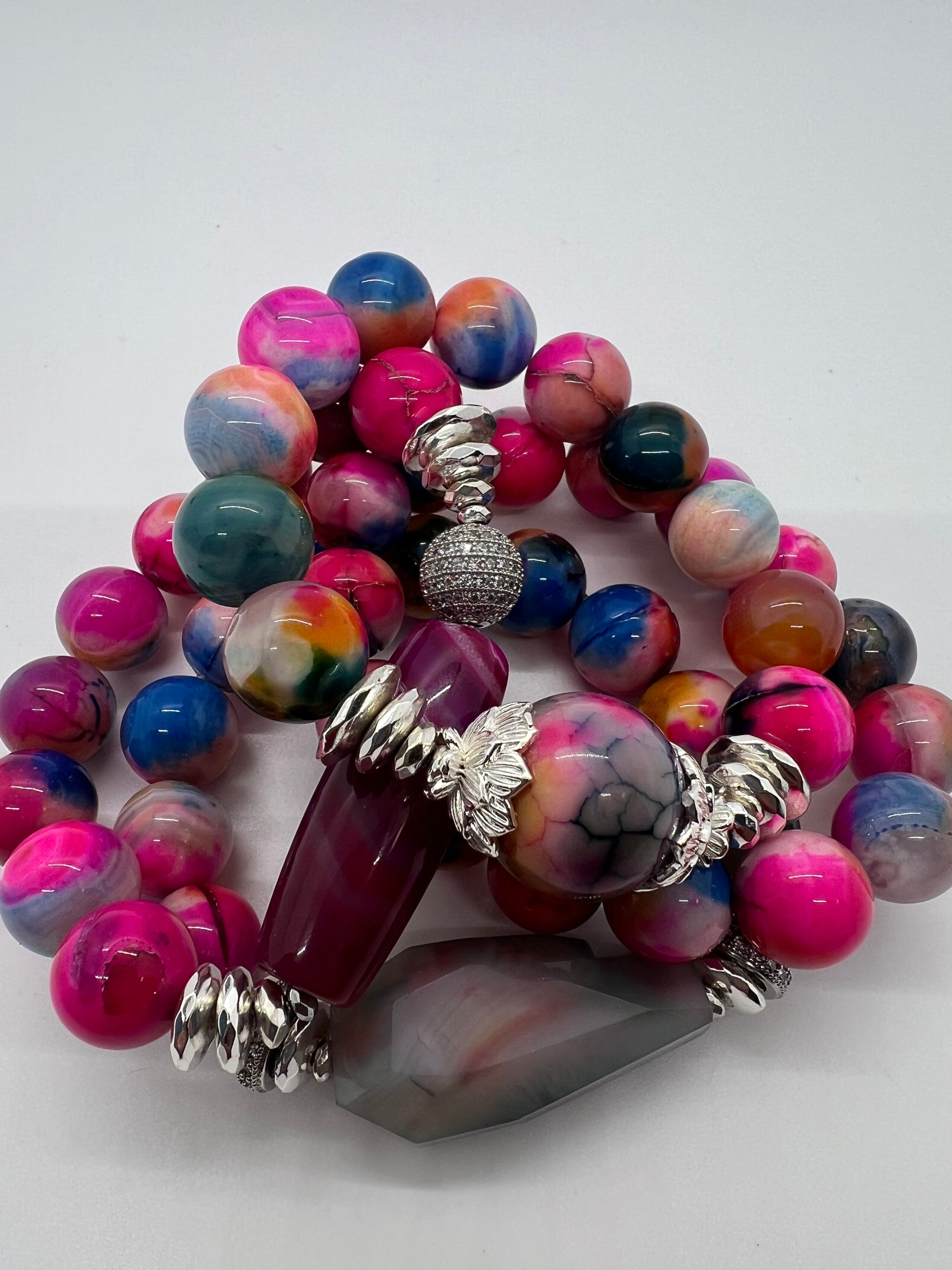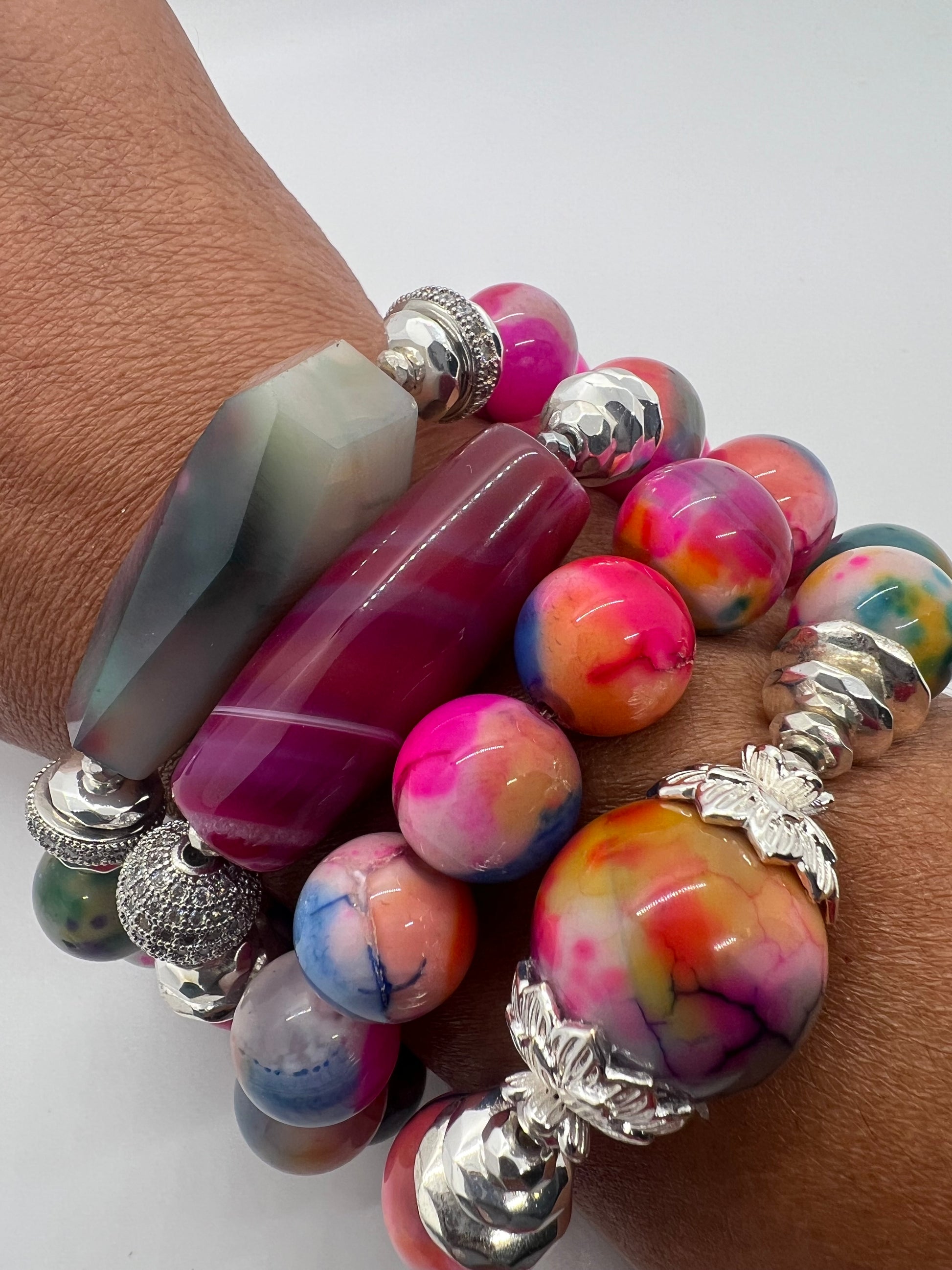 Vibrant, joyful, and unapologetically bold — Chloe brings color and confidence to every look. This four-piece bracelet set showcases radiant dragon vein agate beads bursting with electric shades of fuchsia, coral, turquoise, and golden peach. Each stone is naturally marbled, giving every bracelet a one-of-a-kind artistic flair.