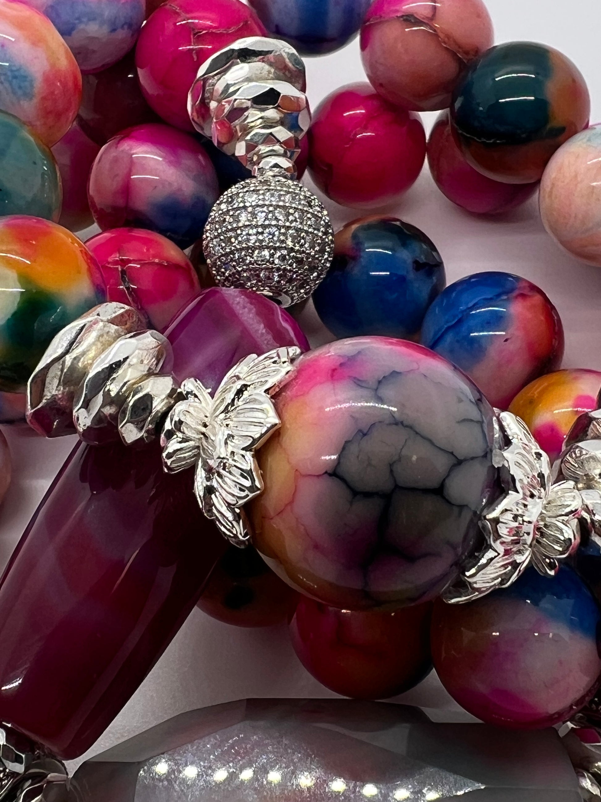 The set includes two full 14 mm agate bead bracelets accented with pavé crystal and faceted silver spacers, plus two showstopping statement designs featuring elongated faceted agate focal beads in smoky grey and deep magenta. Together, they create a stunning, layered look that moves effortlessly from day to night.