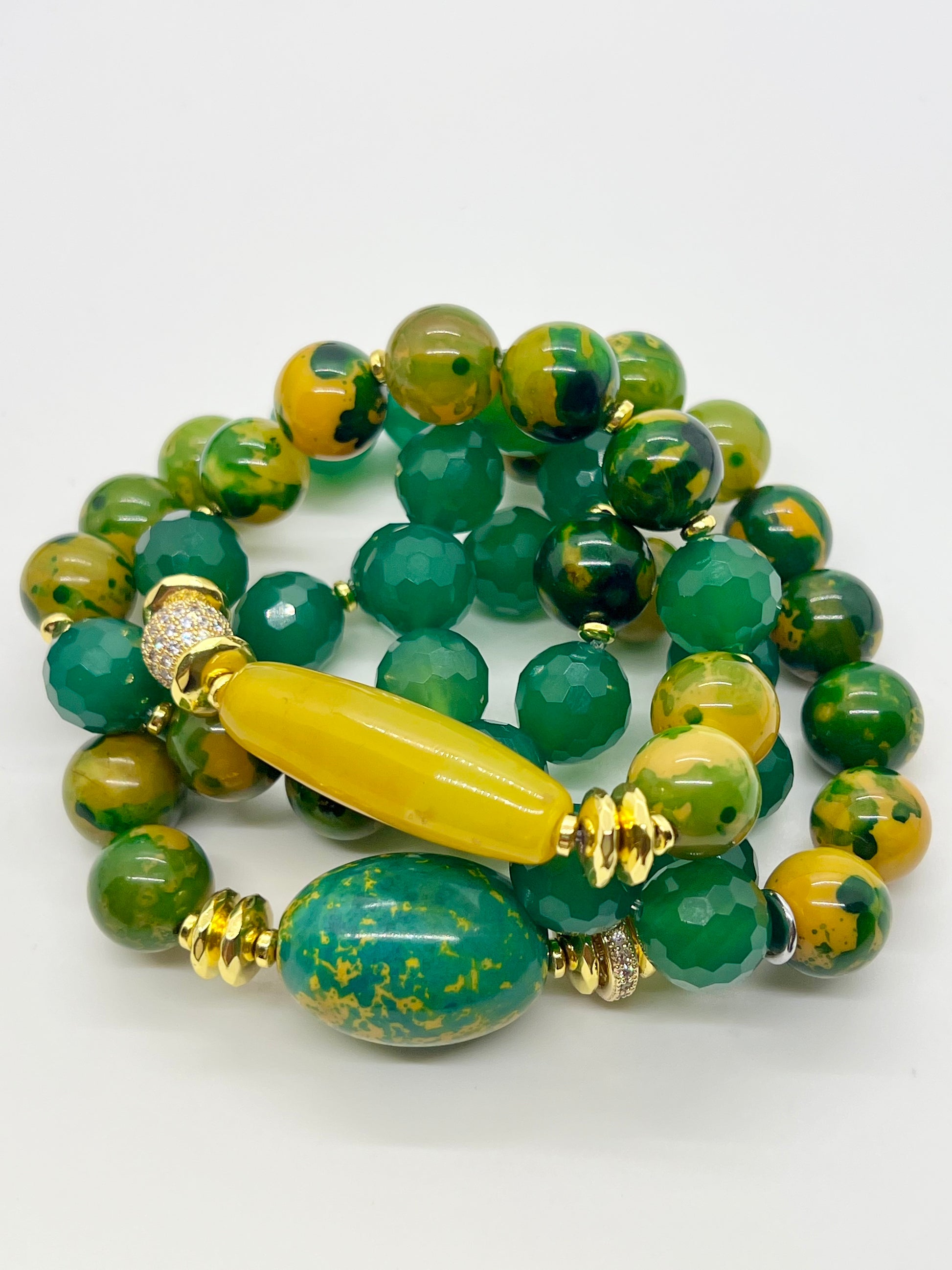 Golden Bloom is vibrant, fresh, and full of life, designed to bring a bold yet uplifting energy to your stack. Featuring a beautiful mix of 14 mm jade and agate beads in rich greens and sunshine yellow tones, this four piece set radiates warmth, optimism, and effortless style.