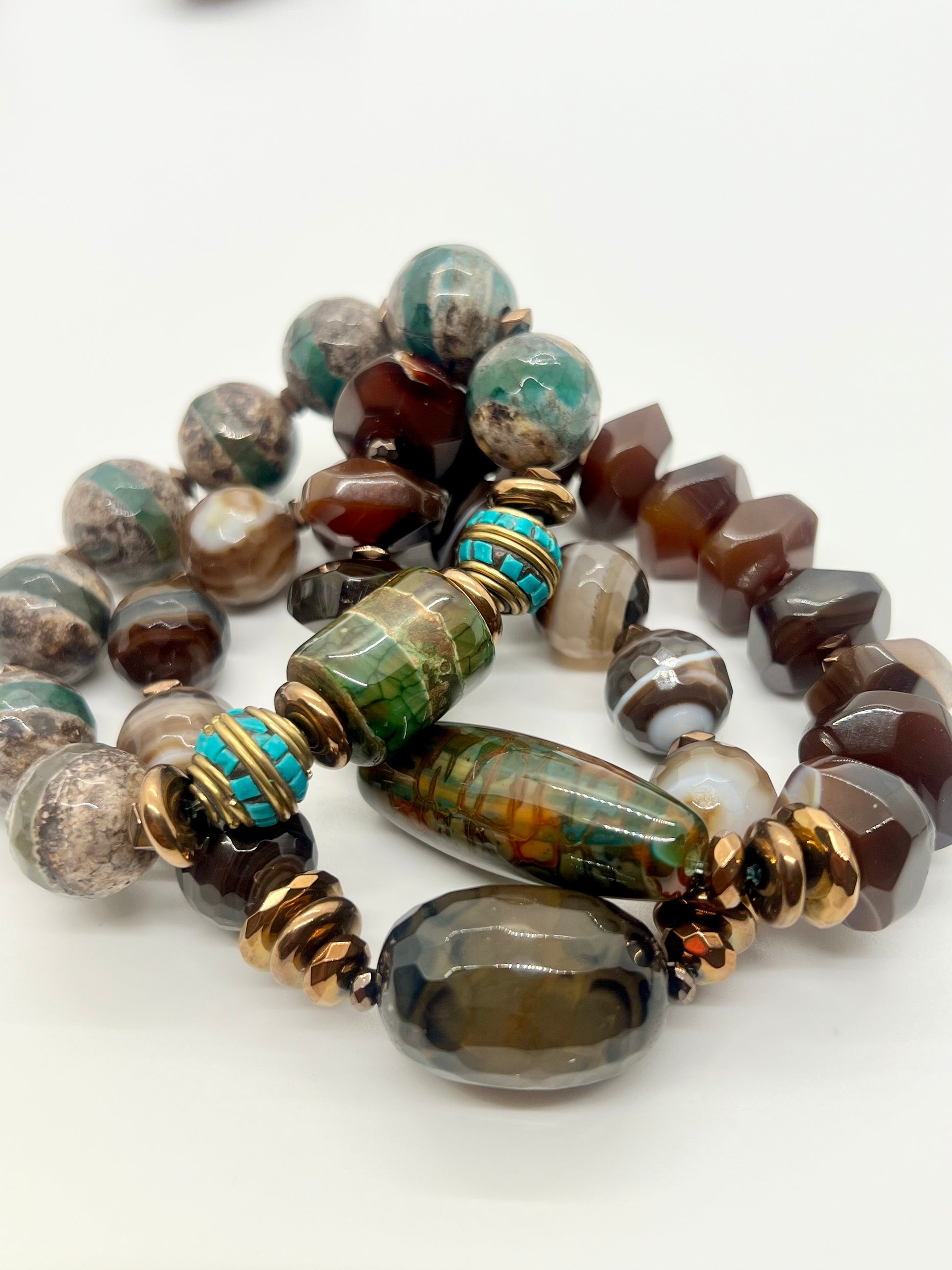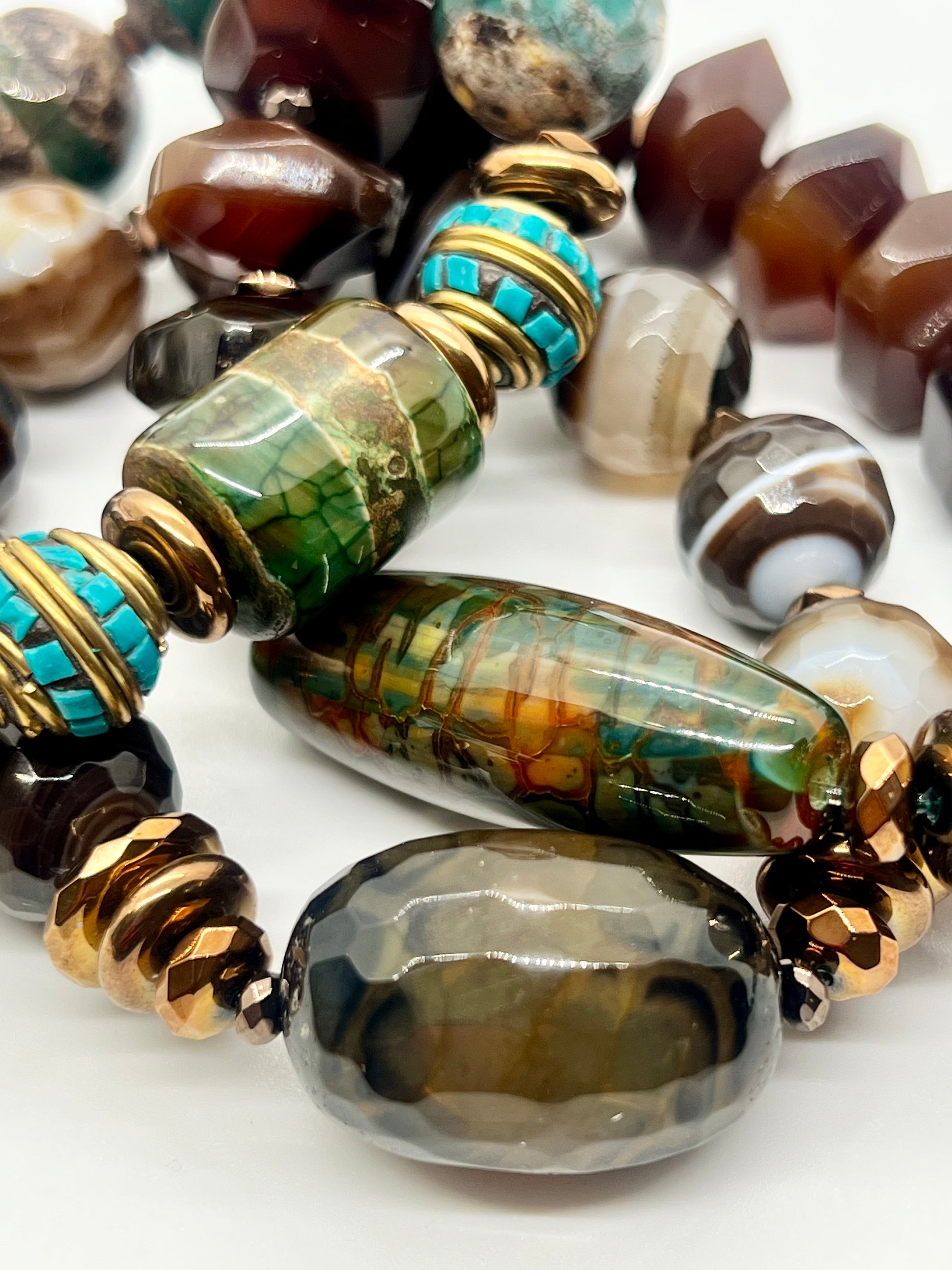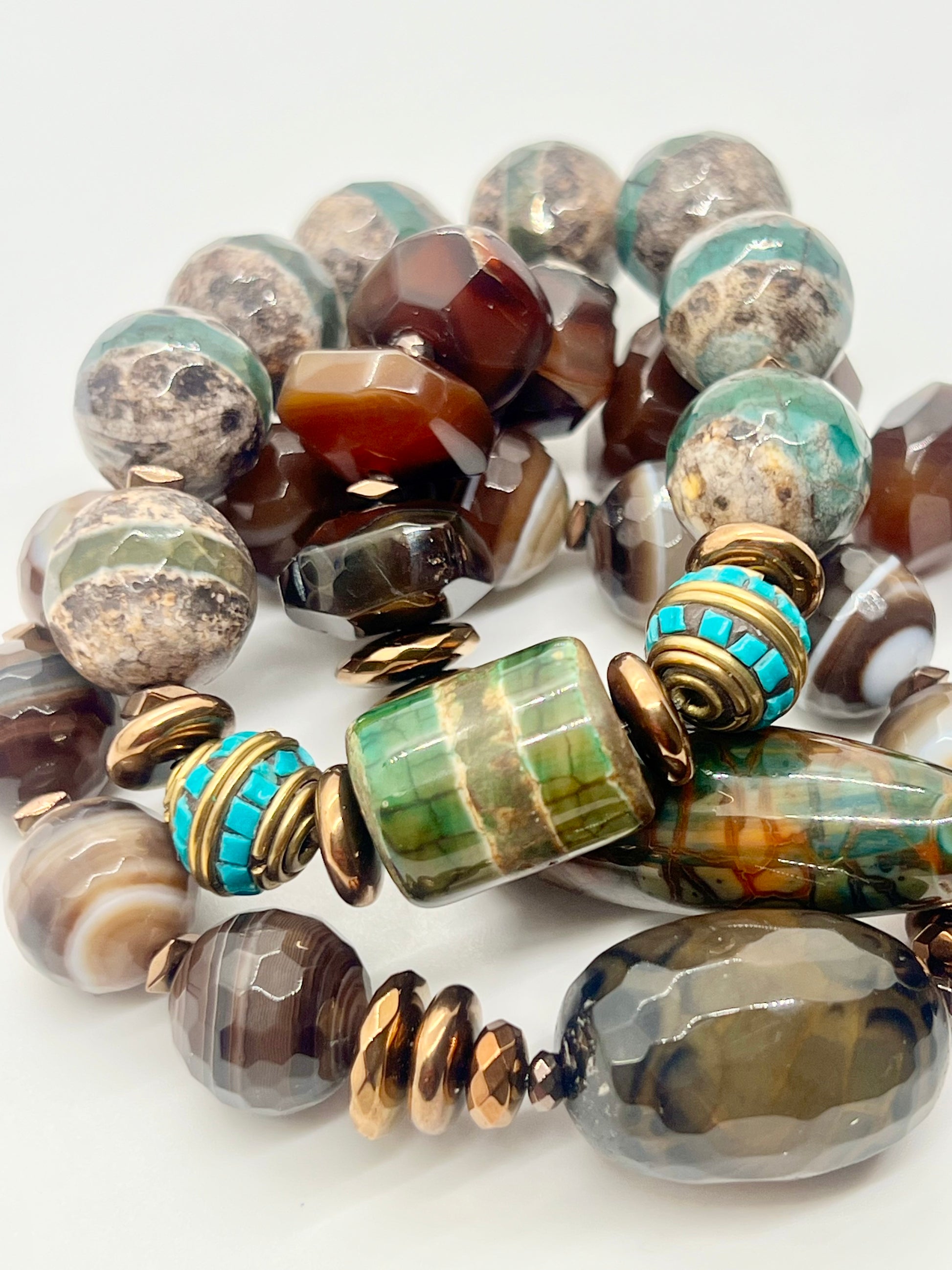 The design features banded agates and Tibetan agate beads in warm browns, soft creams, and natural turquoise tones that evoke the beauty of desert landscapes. Sculptural focal stones add depth and dimension, while chocolate hematite and metallic rondel spacers introduce a polished, modern finish that ties the palette together with subtle shine.