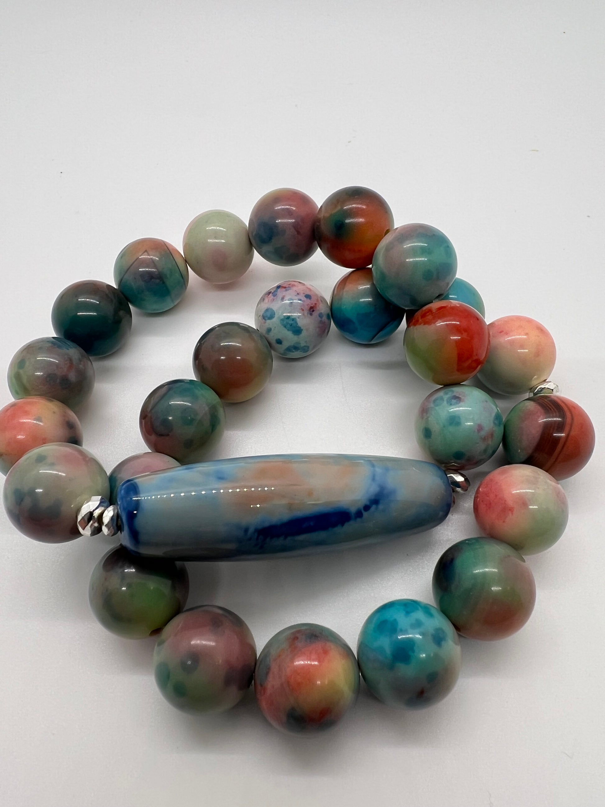 One bracelet is highlighted by a sleek elongated barrel-shaped focal bead in soothing shades of sky blue and peach, accented with faceted silver-tone spacers for a touch of sparkle. The second bracelet lets the 14 mm round beads shine on their own, offering a bold yet versatile style.